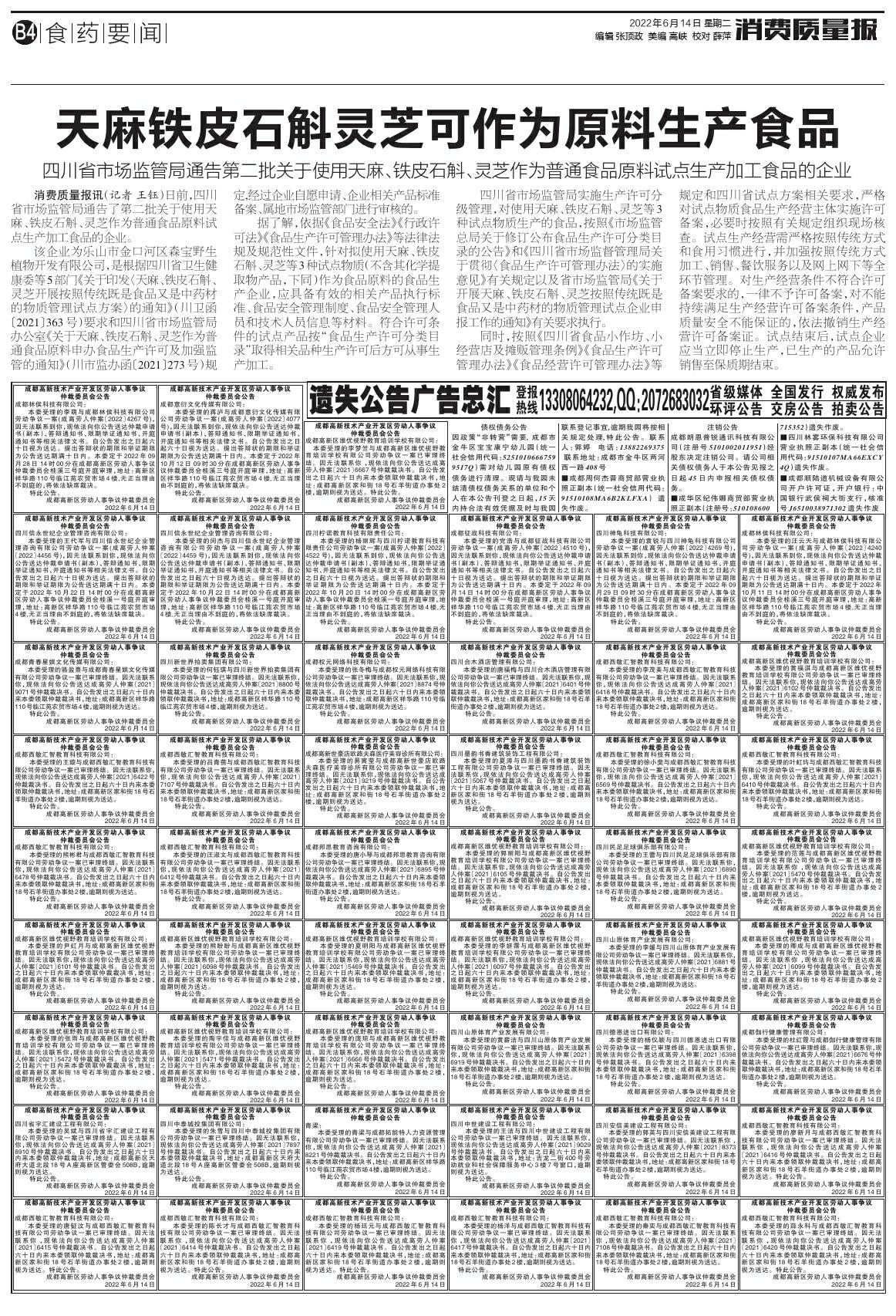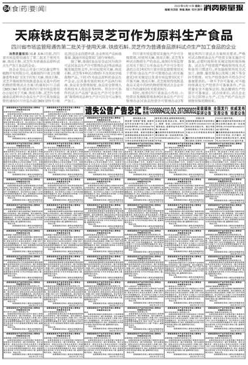 消费质量报讯(记者 王钰)日前,四川省市场监管局通告了第二批关于使用天麻、铁皮石斛、灵芝作为普通食品原料试点生产加工食品的企业。
