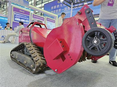 在科技创新成果主题馆内,一台三角形轮胎的红色机器十分吸引眼球。这是一台山地果园灌木清理智能除草机,由重庆文理学院的设计研发团队制作而成。