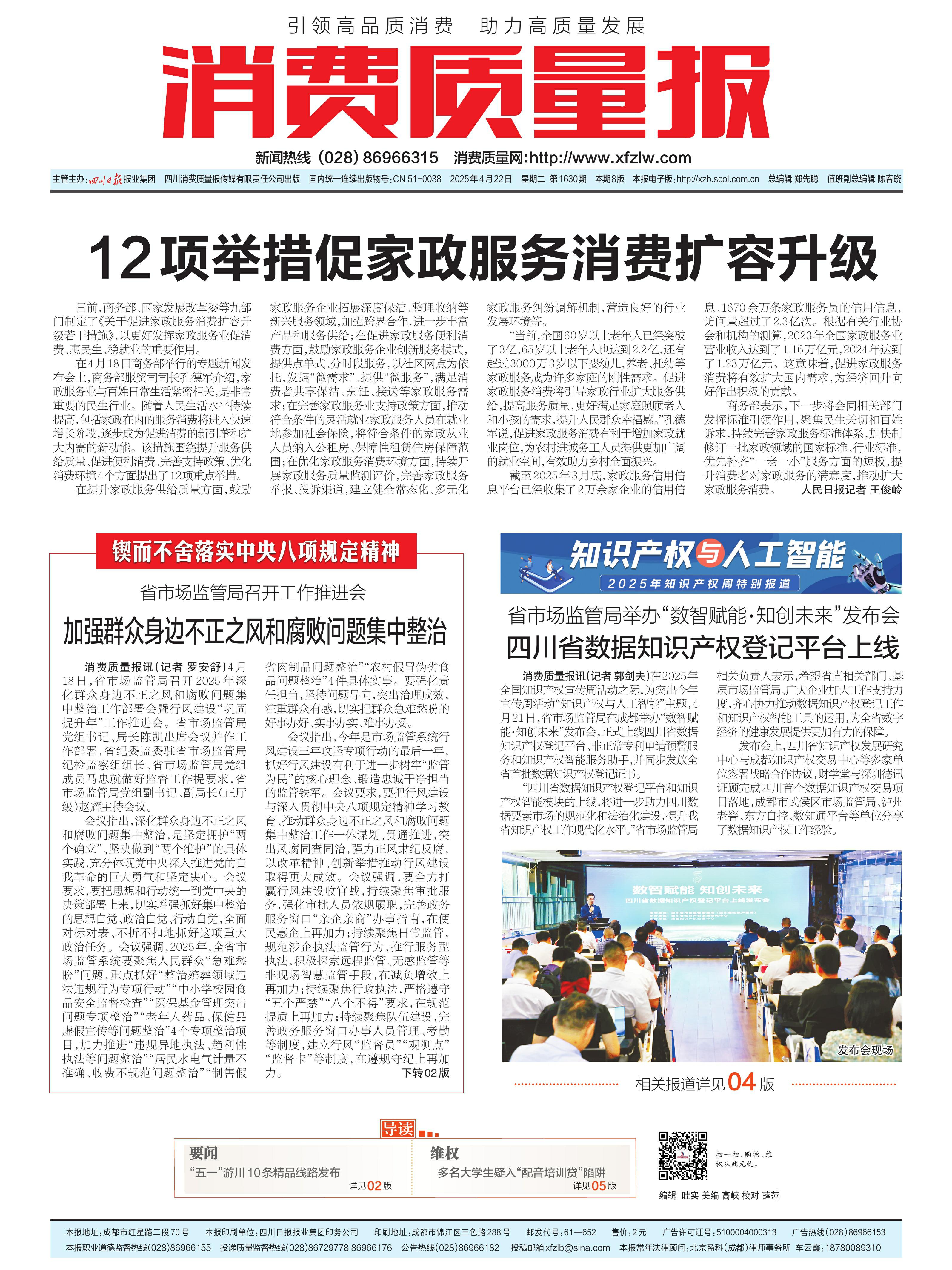 消费质量报讯(记者 郭剑夫)在2025年全国知识产权宣传周活动之际,为突出今年宣传周活动“知识产权与人工智能”主题,4月21日,省市场监管局在成都举办“数智赋能·知创未来”发布会,正式上线四川省数据知识产权登记平台、非正常专利申请预警服务和知识产权智能服务助手,并同步发放全省首批数据知识产权登记证书。