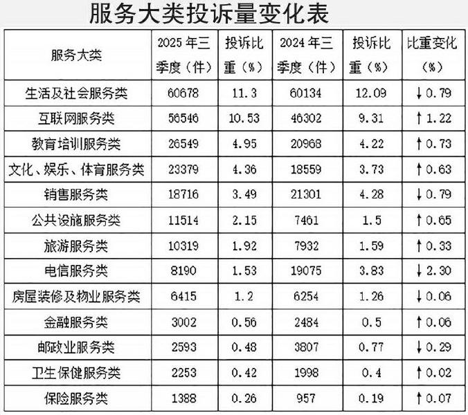 生活及社会服务类、互联网服务类、教育培训服务类、文化娱乐体育服务类、销售服务类居服务大类投诉前五位。与2024年三季度相比,互联网服务类,教育培训服务类,公共设施服务类投诉量比重上升,电信服务类,销售服务类,生活及社会服务类投诉量比重下降。