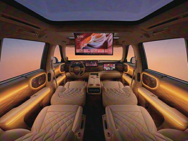 内饰方面,两款车型均展现出旗舰级的用料水准。智己LS9采用大地象灰主题内饰,提供深、浅两种配色可选,以豪华、舒适为核心。车内大面积采用Nappa真皮包裹,搭配金属镀铬条点缀,触感细腻温润。座椅采用IM Nappa DELUXE高定头层真皮,内部填充高密度海绵,并标配通风、加热和按摩功能。同时,智己LS9的三排六座座椅靠背均可调节角度,后排纯平地板设计让儿童可直立行走。后备箱常规容积为372L,最大可扩展至1030L。