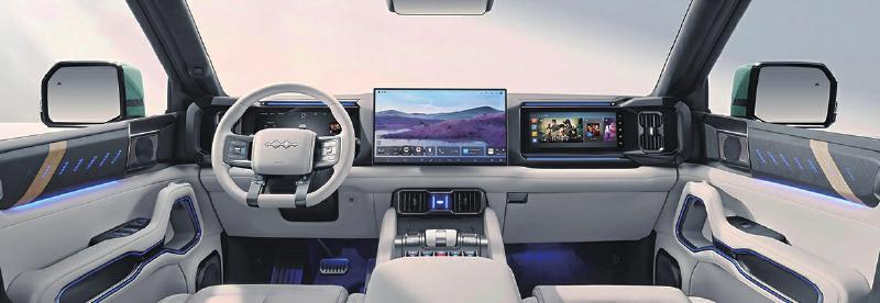 智能座舱已经成为当前中国品牌硬派SUV的标配。捷途纵横G700搭载纵横OS系统+高通8255芯片。中控台顶部贯穿式35.4英寸山脉天际屏十分惊艳,与15.6英寸中控屏、17.3英寸后排娱乐屏、8.8英寸后排空调屏组成四屏联动的巨幕系统,视觉效果震撼。豹8中控台由三联屏组成,包括12.3英寸的全液晶仪表、17.3英寸的中控大屏以及12.3英寸的副驾娱乐屏组成,内置DiLink 150智能座舱高阶版系统,搭配BYD自研9000芯片,辅以AI大模型语言,功能强大。