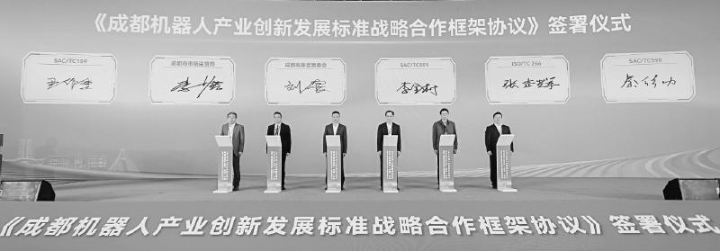 为助力成都人工智能与机器人产业高质量发展,大会推介了成都市人工智能与机器人产业情况,签署了《支持成都机器人产业创新发展标准战略合作框架协议》,构建了国家级标准资源与地方产业协同发展的战略通道。成都市市场监管局、成都高新区管委会与国际仿生学标准化技术委员会、全国机器人标准化技术委员会、全国自动化系统与集成标准化技术委员会、全国仿生学标准化技术委员会共同构建了协同合作机制,将在标准制修订、宣贯实施、资源共享等多方面深化合作,旨在整合国家级标准化资源与地方产业优势,共同推动成都人工智能与机器人产业链与标准链融合创新发展。同时,多家成都龙头企业将加入相关标准化技术组织,主导和参与关键领域的国家标准制定,贡献成都智慧。