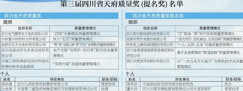 第三届天府质量奖榜单揭晓