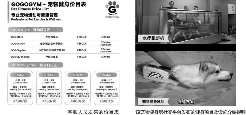 记者随后添加该健身房客服人员进一步了解情况。对方发来的一份宠物运动健身价目表显示,店内单次宠物运动项目价格在300元至480元不等,单次时长为30分钟。相较之下,这一价格已明显高于许多成人健身一对一私教课的消费水平。此外,该健身房的宠物日托项目,根据宠物体重不同,价格也高达300元至500元。