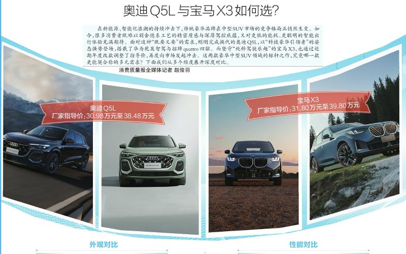 在新能源、智能化浪潮的持续冲击下,传统豪华品牌在中型SUV市场的竞争格局正悄然生变。如今,很多消费者既难以割舍德系工艺的精密质感与深厚驾控底蕴,又对更低的能耗、更聪明的智能出行体验充满期待。面对这种“既要又要”的需求,刚刚完成换代的奥迪Q5L,以“科技豪华引领者”的姿态强势登场,搭载了华为乾崑智驾与招牌quattro四驱。而坚守“纯粹驾驶乐趣”的宝马X3,也通过近期年度改款调整了指导价,再度向市场发起冲击。这两款豪华中型SUV领域的标杆之作,究竟哪一款更能契合你的多元需求?下面我们从多个维度展开深度对比。