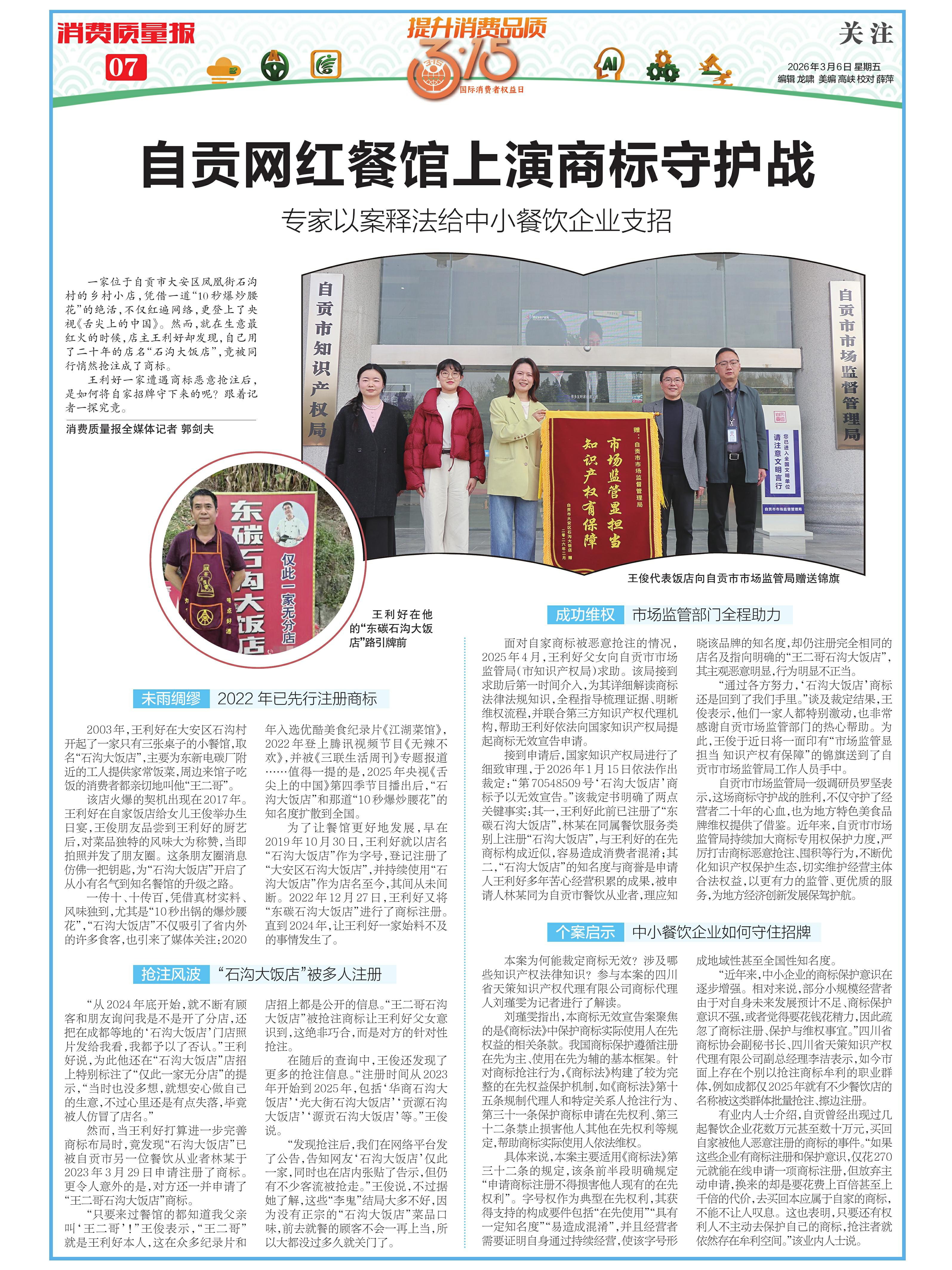 自贡市市场监管局一级调研员罗坚表示,这场商标守护战的胜利,不仅守护了经营者二十年的心血,也为地方特色美食品牌维权提供了借鉴。近年来,自贡市市场监管局持续加大商标专用权保护力度,严厉打击商标恶意抢注、囤积等行为,不断优化知识产权保护生态,切实维护经营主体合法权益,以更有力的监管、更优质的服务,为地方经济创新发展保驾护航。
