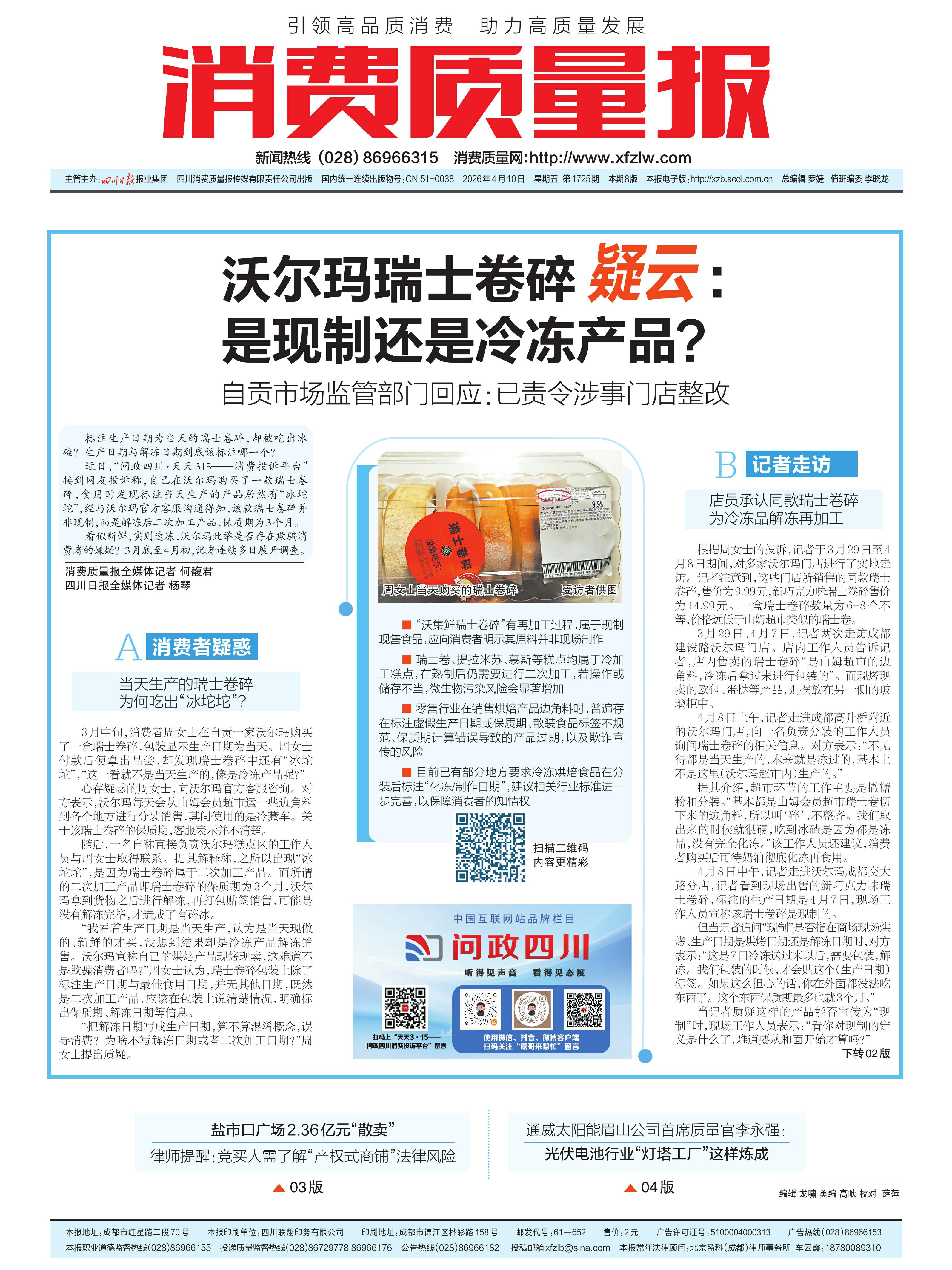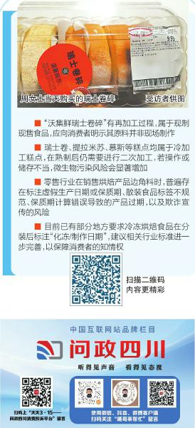 近日,“问政四川·天天315——消费投诉平台”接到网友投诉称,自己在沃尔玛购买了一款瑞士卷碎,食用时发现标注当天生产的产品居然有“冰坨坨”,经与沃尔玛官方客服沟通得知,该款瑞士卷碎并非现制,而是解冻后二次加工产品,保质期为3个月。