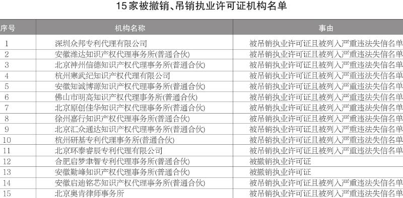 与此同时,四川北新律师事务所等15家机构因已注销,其专利申请预审代理资格也自即日起被取消。