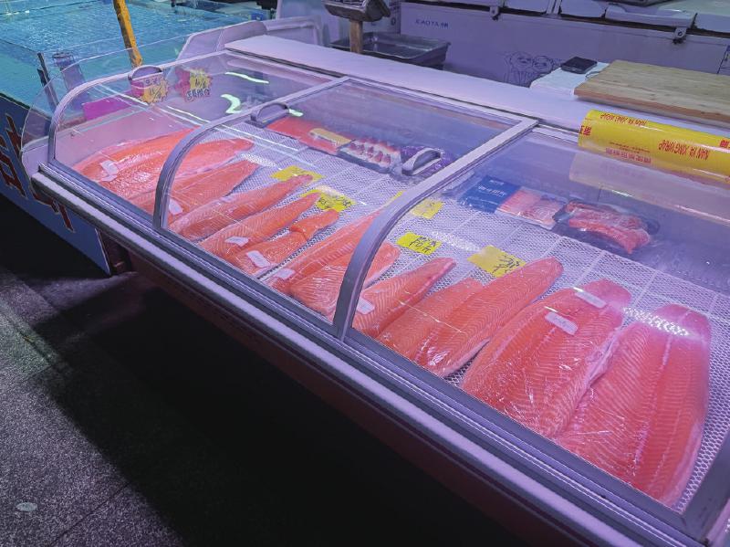 但尴尬的是,在纸面上,国产三文鱼产量不小,价格、供应链时效上也均有优势,但在实际中却难以摆上主流货架。在成都农产品中心批发市场海鲜购物广场,记者未发现国产三文鱼在售。