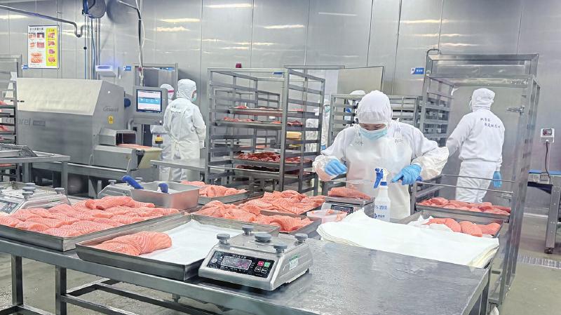 4月9日下午,记者走进成都市双流区西部生鲜港的一处进口三文鱼加工车间。车间内,身着统一洁净工装、佩戴口罩与手套的工人们正有序作业,冰鲜三文鱼进入生产线后,经去头、开片、修整、分切、封装等工序,不一会儿就变成了超市里常见的一盒盒封装好的三文鱼切片。